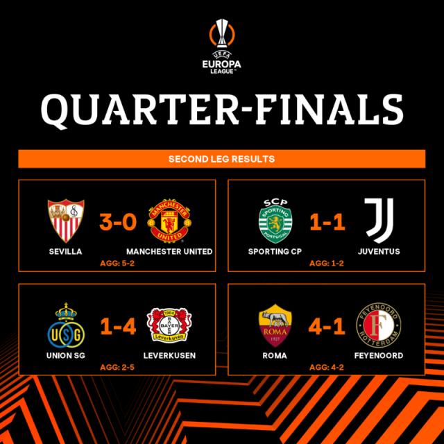 欧联杯1/4决赛两回合全部战罢:塞维利亚两回合总比分5比2淘汰曼联,尤文图斯总比分2比1淘汰里斯本竞技,罗马总比分4比2淘汰费耶诺德,勒沃库森总比分5比2淘汰圣吉罗斯联。