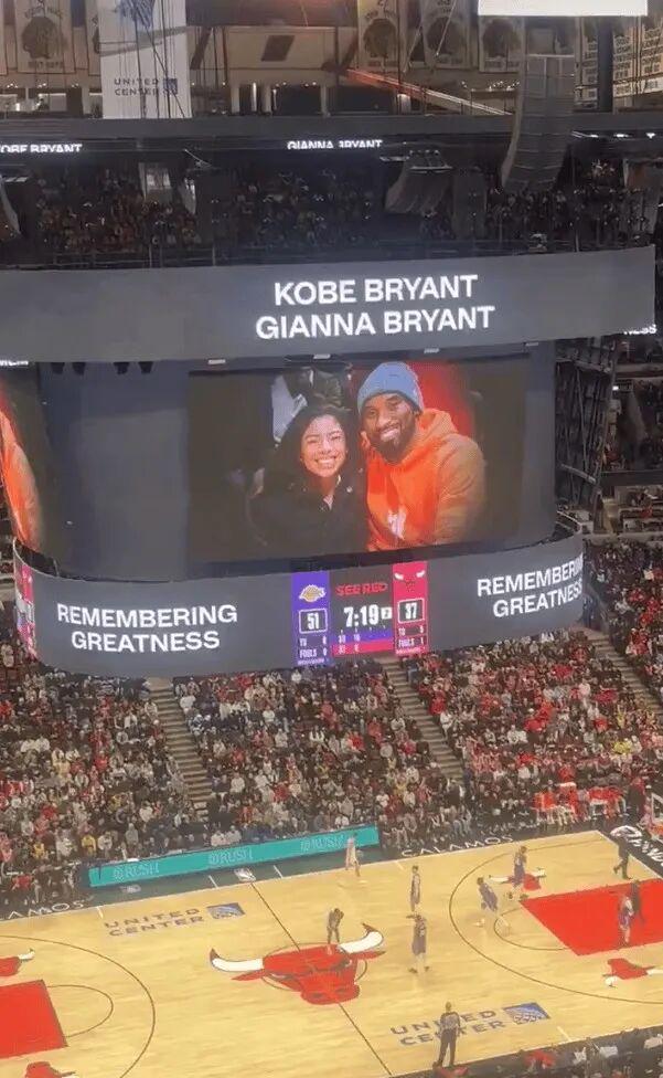 联盟在六年后的今天安排了湖人与公牛的比赛,主场的大屏展示科比与GG的照片依然那么慈祥。